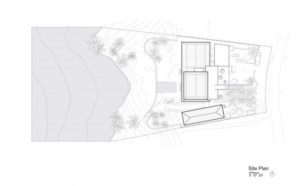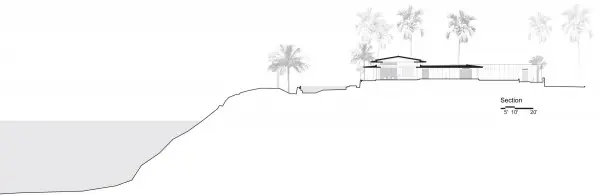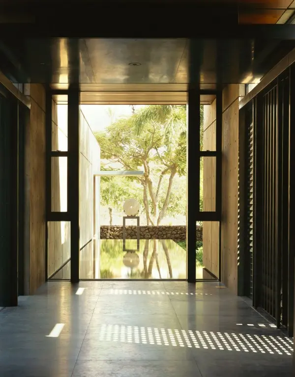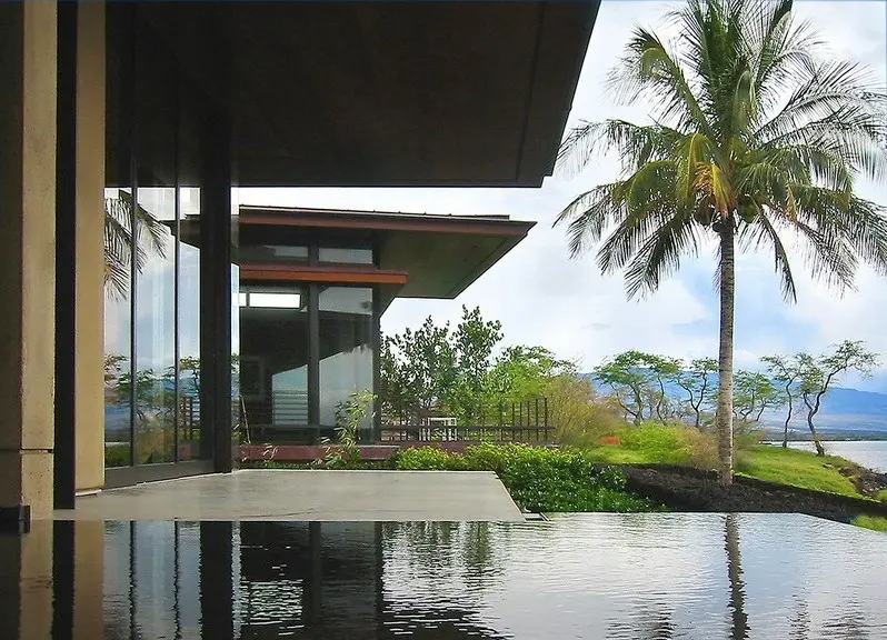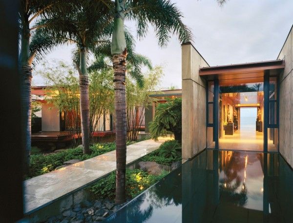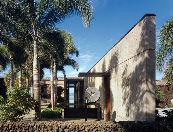 Ridicata intr-o zona foarte pitoreasca, pe roci vulcanic, exteriorul acestei case tropicale are o viziune contemporana pronuntata, cu pereti largi si generosi pentru a oferi umbra in curtea interioara, ferind proprietarii de soarele hawaiian care arde in cea mai mare parte a zilei.
