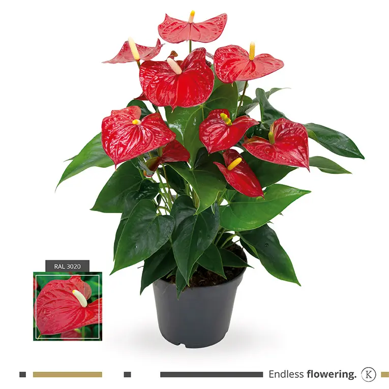 Anthurium, sau Floarea Flamingo, de inaltime medie, cu frunze lucioase de un verde intens si florile rosii, texturate proeminent, adauga o pata curajoasa de culoare si de viata si contribuie la starea de bine, de confort a spatiului, fiind recomandata pentru spatii de lucru sau livinguri.
