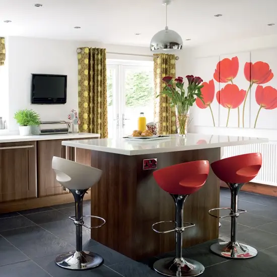 Masa tip insula ofera numeroase avantaje, fiind o varianta multifunctionala ideala pentru spatiile mici, putand fi folosita atat ca blat de lucru precum si ca un bar sau masa de dining. Adaugati si scaune inalte si veti reusi sa va folositi bucataria intr-un mod eficient.