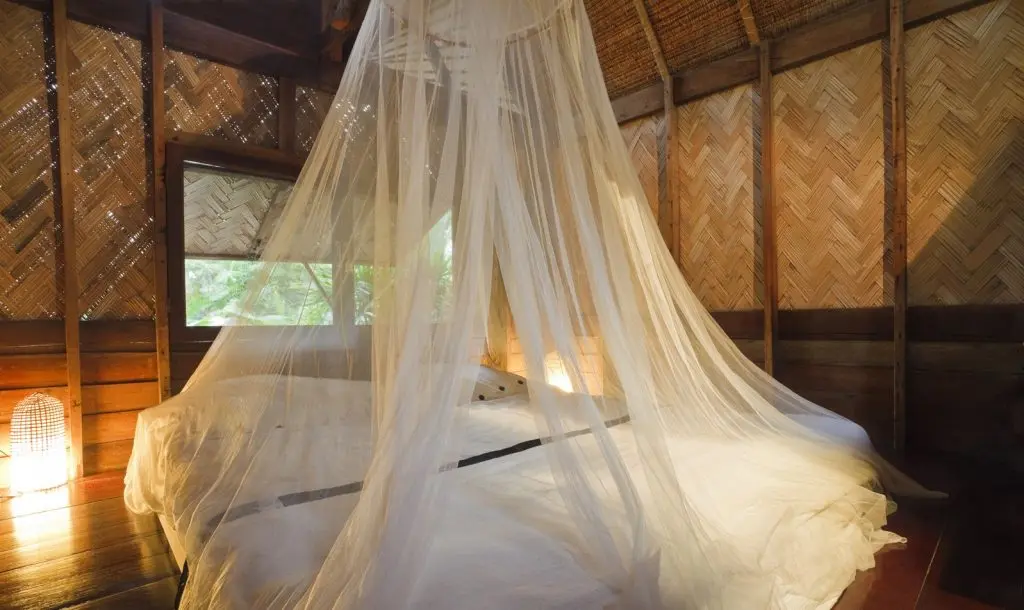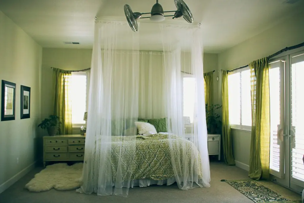 Puteti atarna si o singura sfoara, deasupra centrului patului, si atarna voalul pe ea, creand un efect de cort. Aceasta metoda va transforma cu usurinta dormitorul dumneavoastra intr-un spatiu exotic si, mai ales in incaperile in care se petrec si alte activitati, va zonifica estetic si practic locul de somn de restul camerei.