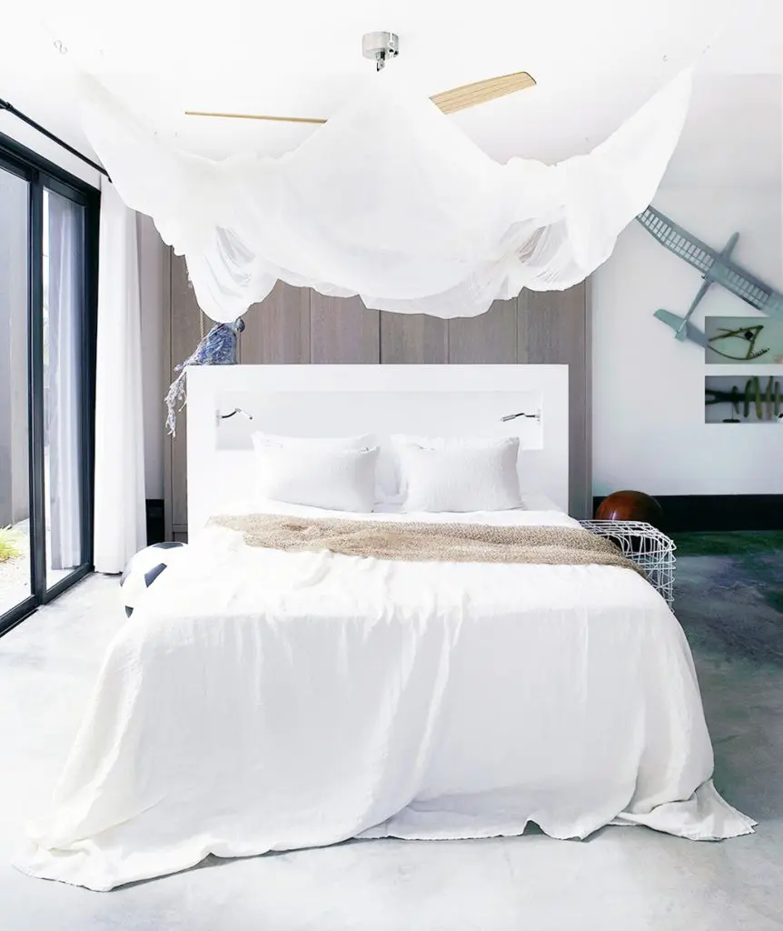 3) Suspendati un cadru metalic rotund (il puteti confectiona din sarma si picta intr-o culoare neutra) deasupra patului si atarnati doua voaluri transparente in fiecare parte, pentru a cuprinde intregul pat.