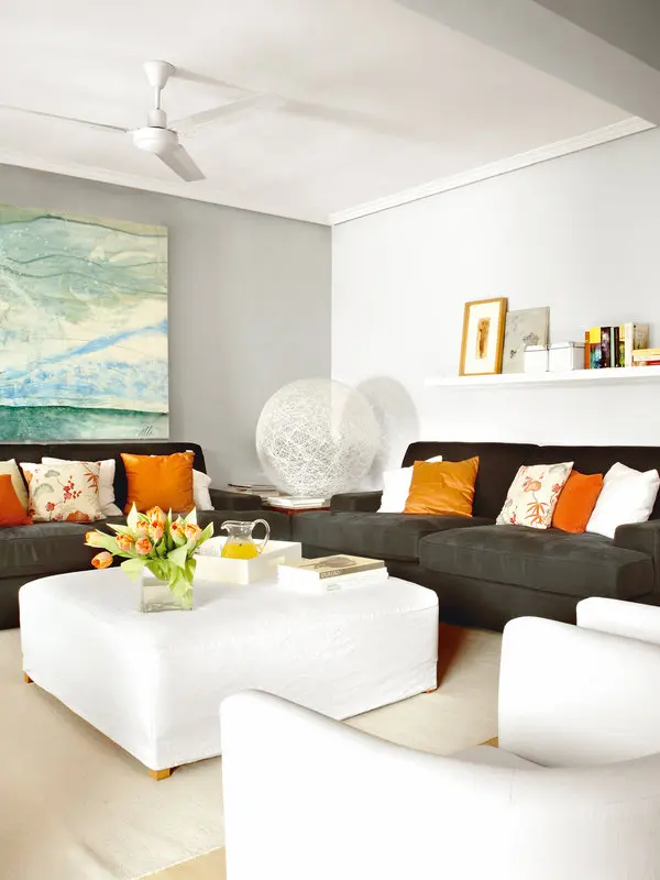 De remarcat culorile folosite in aceasta amenajare predomina albul, cremul, un gri foarte deschis pe pereti si o canapea cu o culoare-accent care contrasteaza armonios si mai ales care atrage atentia. Petele de culoare ca portocaliul sunt binevenite, oferind caldura spatiului.