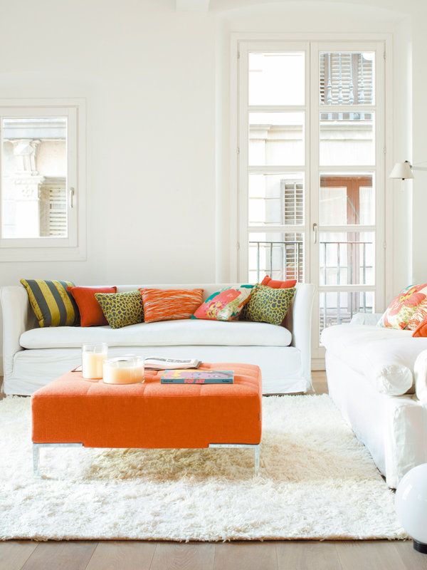 De remarcat culorile folosite in aceasta amenajare predomina albul, cremul, un gri foarte deschis pe pereti si o canapea cu o culoare-accent care contrasteaza armonios si mai ales care atrage atentia. Petele de culoare ca portocaliul sunt binevenite, oferind caldura spatiului.