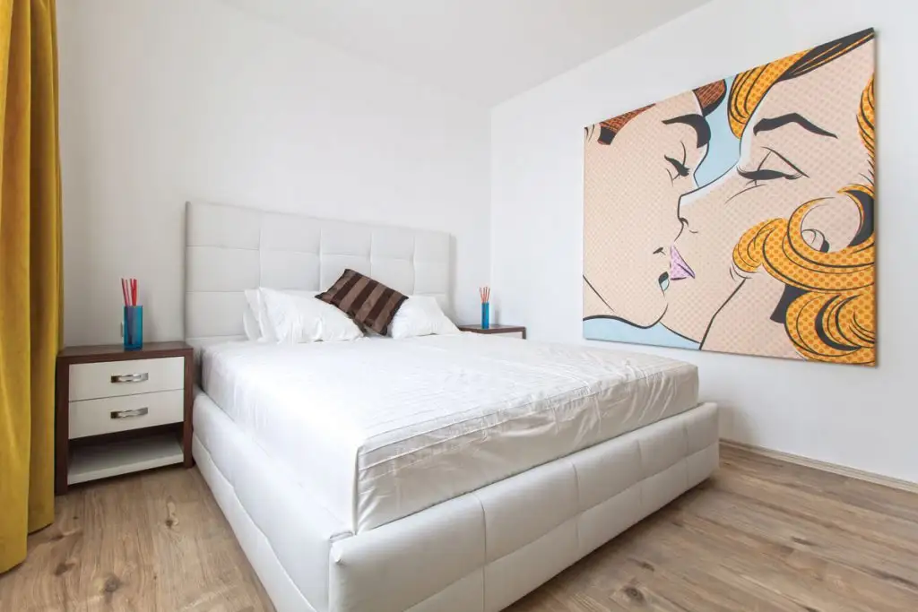 Nuanta de fundal poate fi albul sau un crem discret care vor pastra camera luminoasa. Poti realiza un perete-accent folosind un ton mai inchis sau prin montarea unor tablouri ce vor personaliza incaperea. Ca sa te simti mai confortabil atunci cand stai sprijinit de tablie, alege un model tapitat. De asemenea, poti asorta pernele decorative cu draperia din camera.