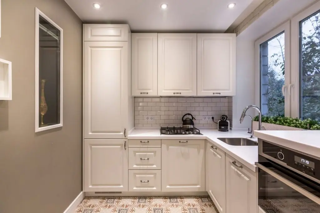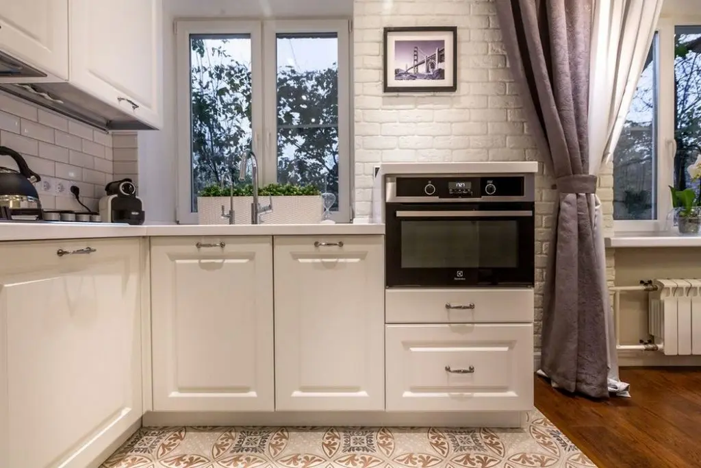Pentru bucatarie au ales mobilier simplu, compact, cu front alb din M DF. Electrocasnicele sunt toate incorporate astfel incat incaperea sa para mai ordonata si unitara. Ca sa fie mai eficient utilizata, corpurile de mobilier sunt dispuse pe doua laturi, incluzand si spatiul de la fereastra. Dorind sa obtina o delimitare discreta, designerii au optat aici pentru o pardoseala diferita de restul camerei; s-au folosit placi ceramice decorative care marcheaza perimetrul cuprins de spatiul tehnic al bucatariei.