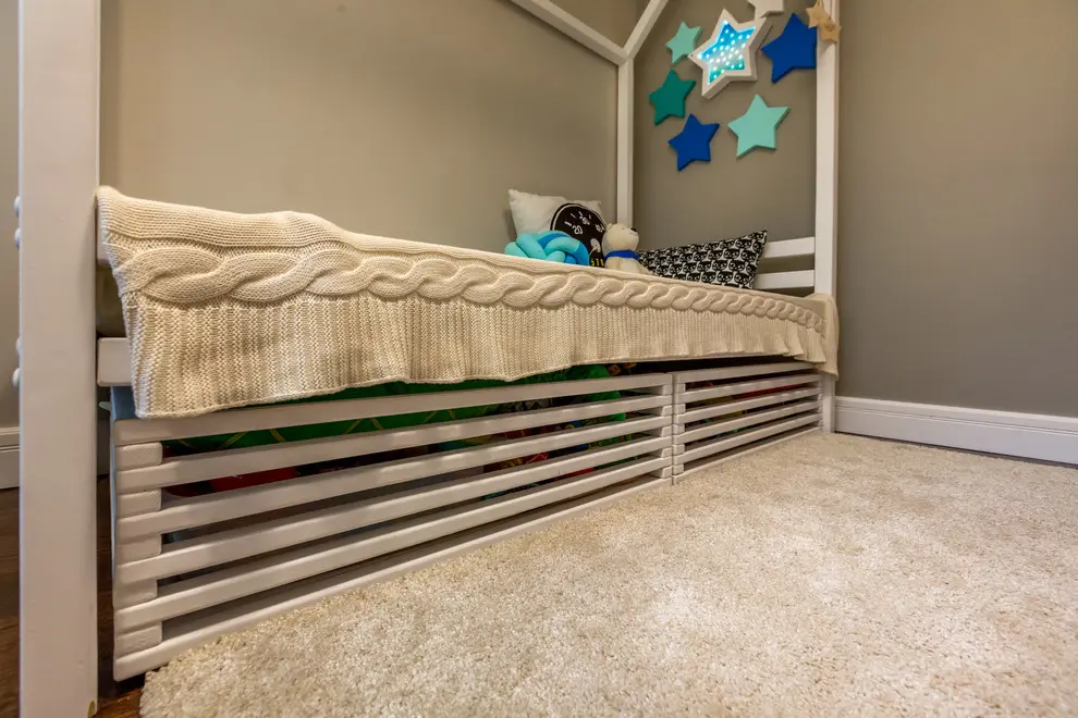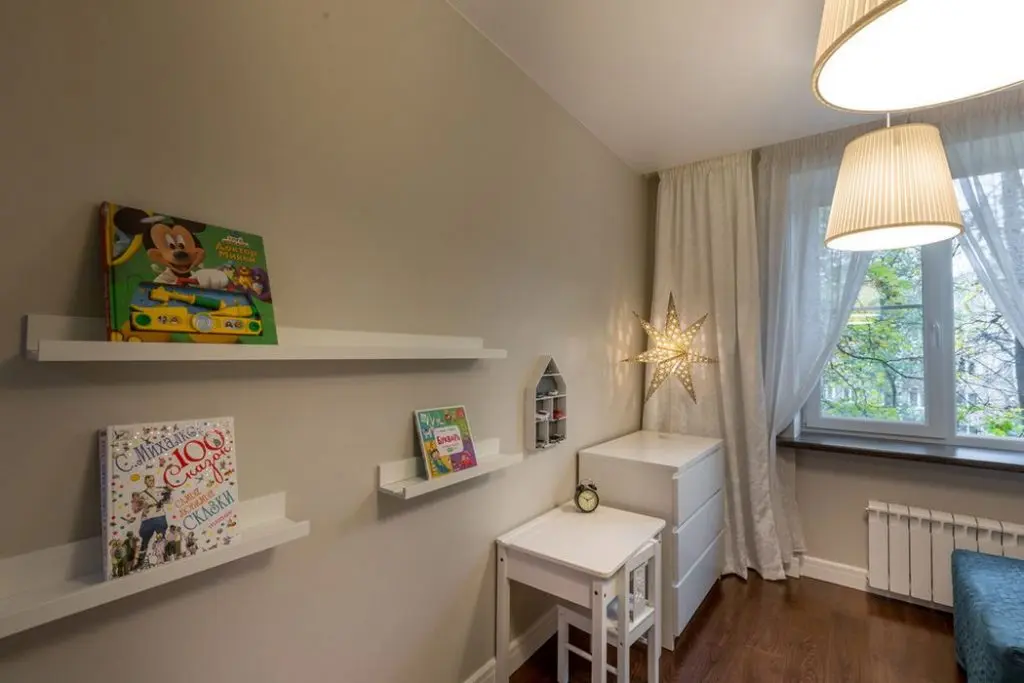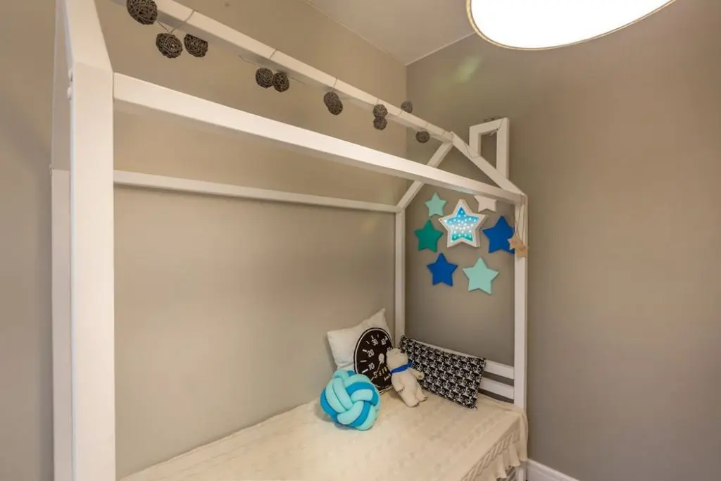 Si in dormitorul matrimonial, totul a fost ales cu atentie pentru a putea integra un pat, doua noptiere si un dulap pentru haine. Nuanta de baza este un bleu discret, cu tapet in dreptul patului si finisaje albe. Mica si ingusta este si camera copilului, iar amenajarea urmeaza aceeasi linie minimala.