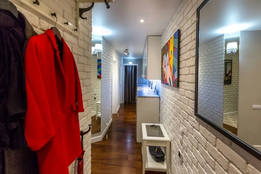 Acelasi tip de finisaje le vom intalni si pe hol: placile ceramice si caramida aparenta. Dupa cum vei vedea si in imagini, holul este ingust, in special portiunea de la intrare. Pentru a satisface nevoia de depozitare, designerii au gandit sa integreze aici dulapuri, o parte de baza si altele suspendate in partea superioara a incaperii, pentru ca la mijloc sa ofere un plus pentru decoratiuni si alte obiecte necesare. Solutia este optima pentru ca nu incarca excesiv spatiul si nu il agreseaza. In plus, in capatul holului a fost amenajat un al doilea loc generos pentru depozitare, intr-o incapere tip camara.