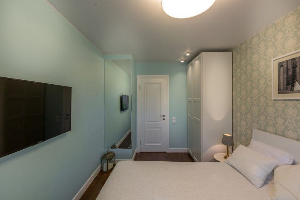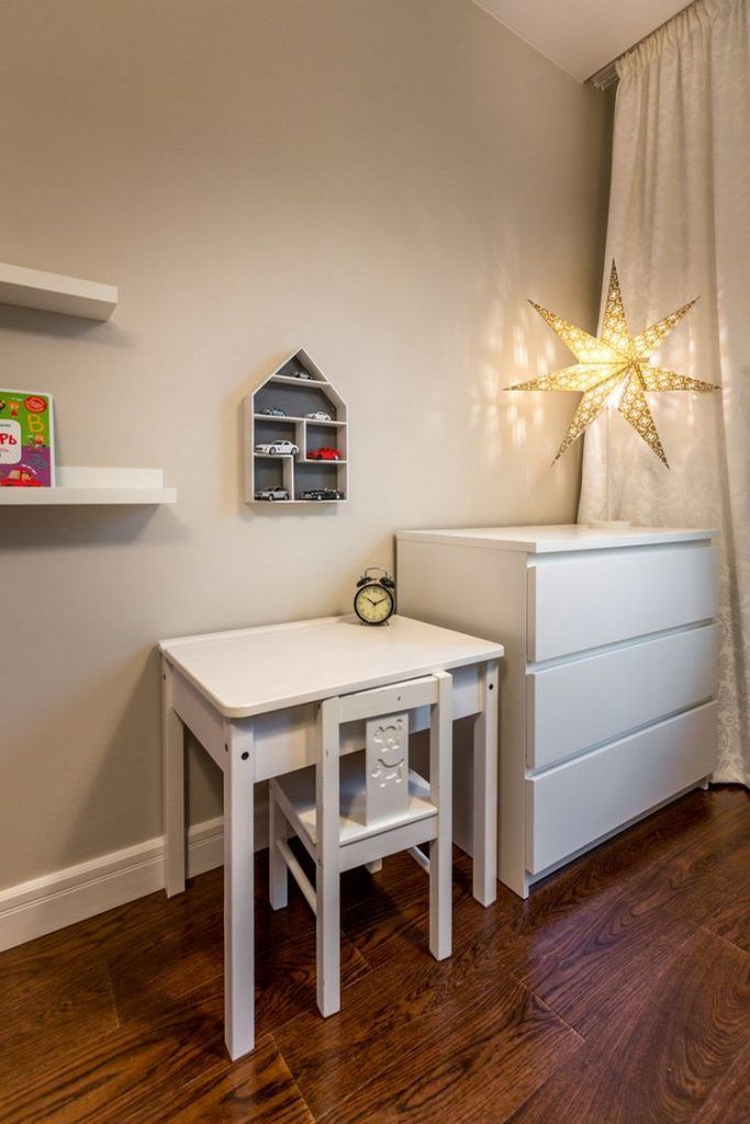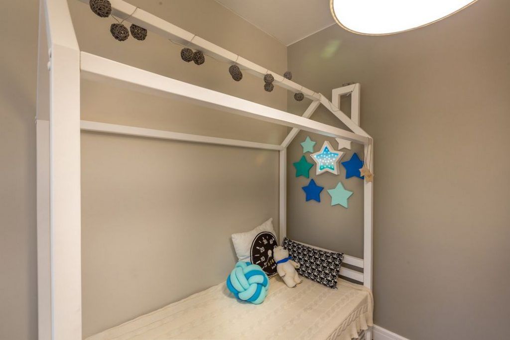 Si in dormitorul matrimonial, totul a fost ales cu atentie pentru a putea integra un pat, doua noptiere si un dulap pentru haine. Nuanta de baza este un bleu discret, cu tapet in dreptul patului si finisaje albe. Mica si ingusta este si camera copilului, iar amenajarea urmeaza aceeasi linie minimala.
