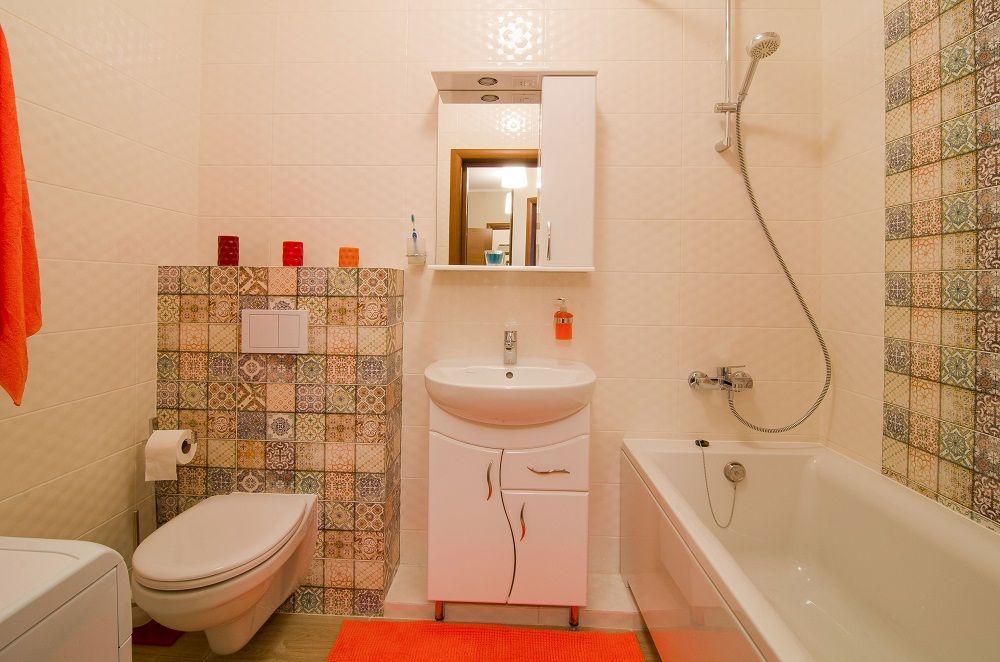 Accentele cromatice le regasim si in bucataria care pastreaza si ea o amenajare functionala. In cei 10 metri patrati, mobilierul configurat in forma literei L, simplu, alb, include si locul de luat masa. Colorata este si baia prin prisma placilor decorative din dreptul vasului de toaleta sau al cazii.