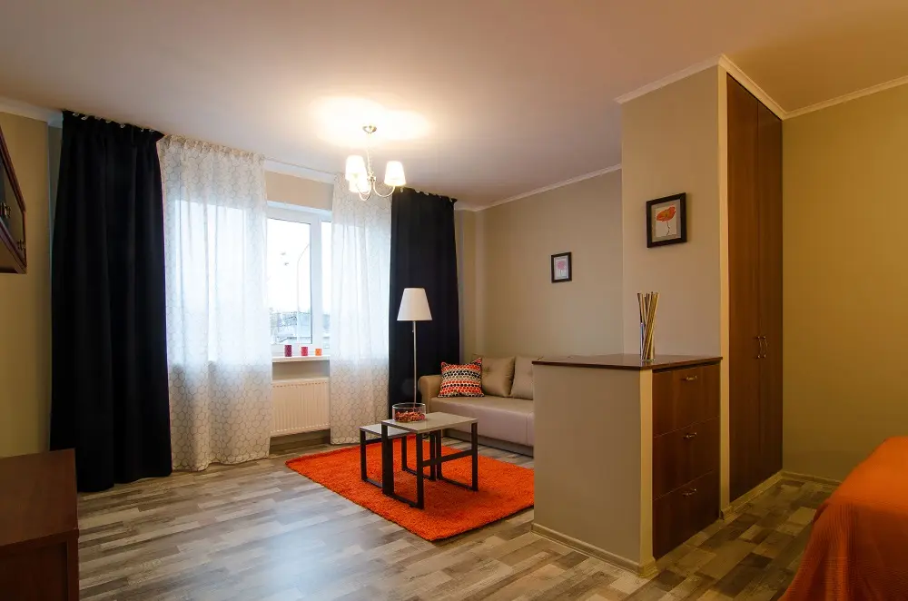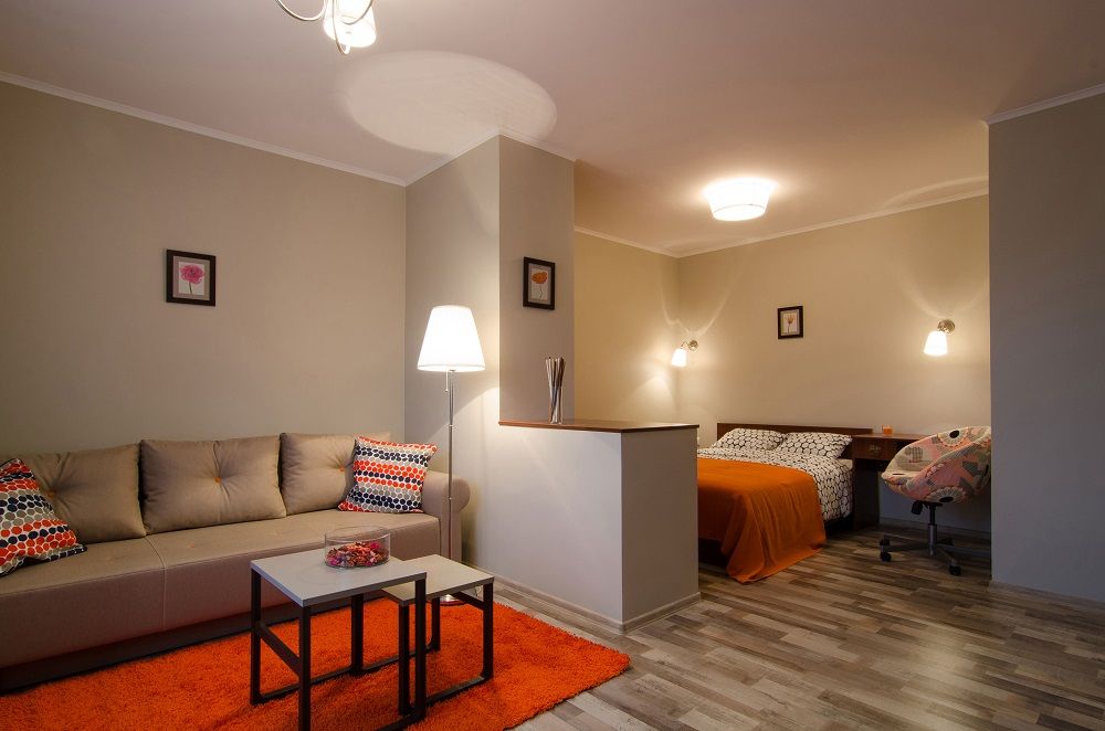Acest apartament iti propune o amenajare simpla, dar cocheta. Pe un fundal neutru, au fost adaugate accente de oranj care anima spatiul. Decorul e minimal, mizand doar pe piesele strict necesare pentru a compune amenajarea. Cu siguranta, acesta este un model de un poti pleca catre ceva mai amplu, conform cu nevoile tale.
