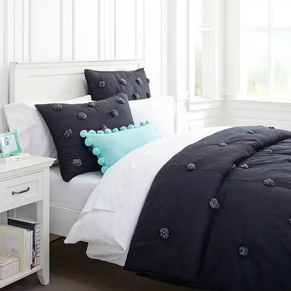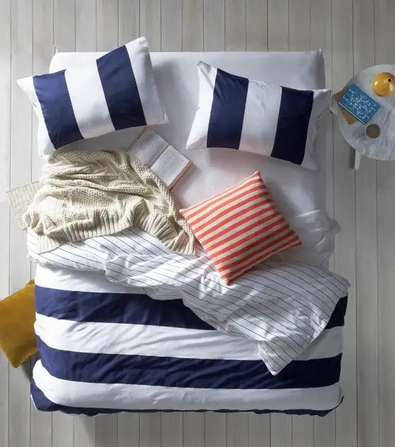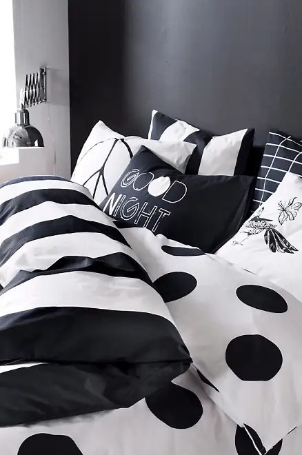 Insa, asternuturile pentru dormitor pot impacta si in combinatiile clasice alb-negru. Proportiile sunt cheia obtinerii unui efect deosebit pentru intreaga amenajare. In acest caz, nu incarcati dormitorul cu decoratiuni sau motive care sa atraga prea mult privirile. Pastrati linii simple, eventual doar alb simplu peste care sa aduceti o cuvertura neagra sau doar perne cu imprimeu in dungi negre.