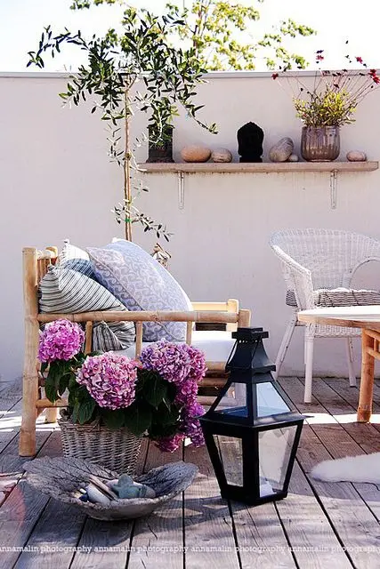 Aduceti o bancuta, un scaun confortabil, o masuta si multe flori colorate si cateva lumanari pentru lumina difuza si iata deja o idee pentru o terasa grozava. Cateva lampi solare inserate printre flori vor fi de mare efect. Lampioanele vor face senzatie printre prieteni, veti petrece seri lungi pe terasa.