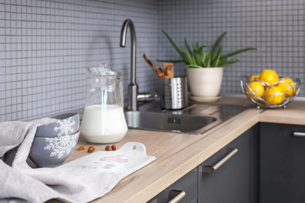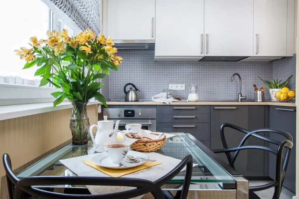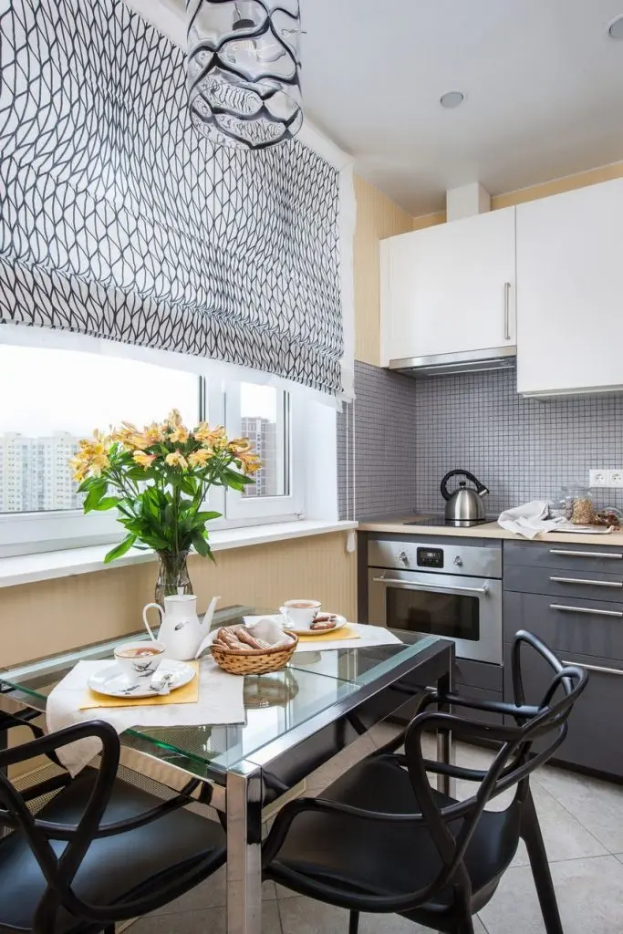 Placut este amenajat si spatiul bucatariei. Linii simple, cu mobilier functional, dispus pe doua laturi. Electrocasnicele de baza sunt incorporate, cu exceptia frigiderului care a fost asezat in spatele usii de acces in bucatarie. In dreptul ferestrei a fost amenajata o zona de luat masa.