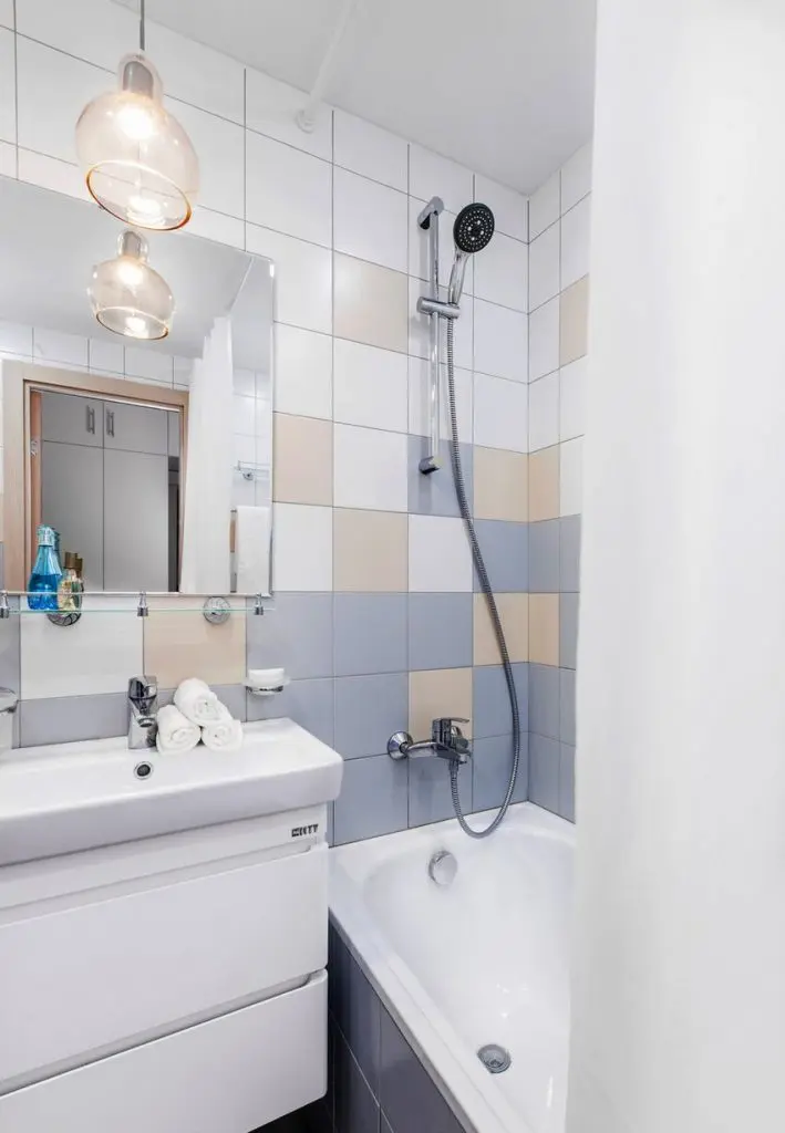 Si in baie s-a mers pe o abordare simpla, in nuante discrete pentru a pastra spatiul cat mai luminos; s-a pastrat cada, iar sub lavoar a fost integrat un mic spatiu de depozitare suspendat. Tot aici a fost asezata si masina de spalat rufe cu un dulap deasupra pentru detergenti si produse de curatat.