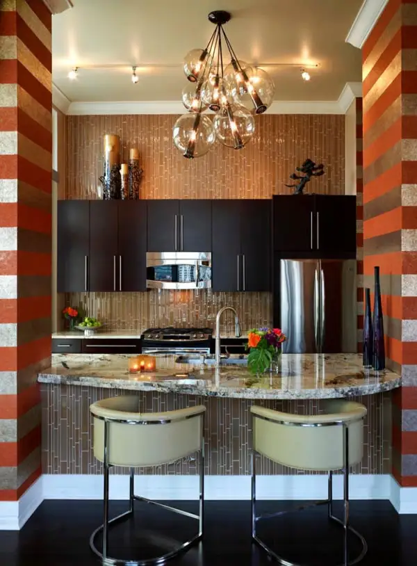 Oferiti bucatariei un decor modern cu tapet colorat sau cu elemente grafice specifice acestui spatiu. Puteti folosi stickere pentru flise, pe care sa le puteti dezlipi usor cand doriti o noua schimbare. Un trend care revine in design-ul de interior este caramida. Daca va simtiti confortabil cu aceasta idee, puteti crea un intreg perete din caramida.
