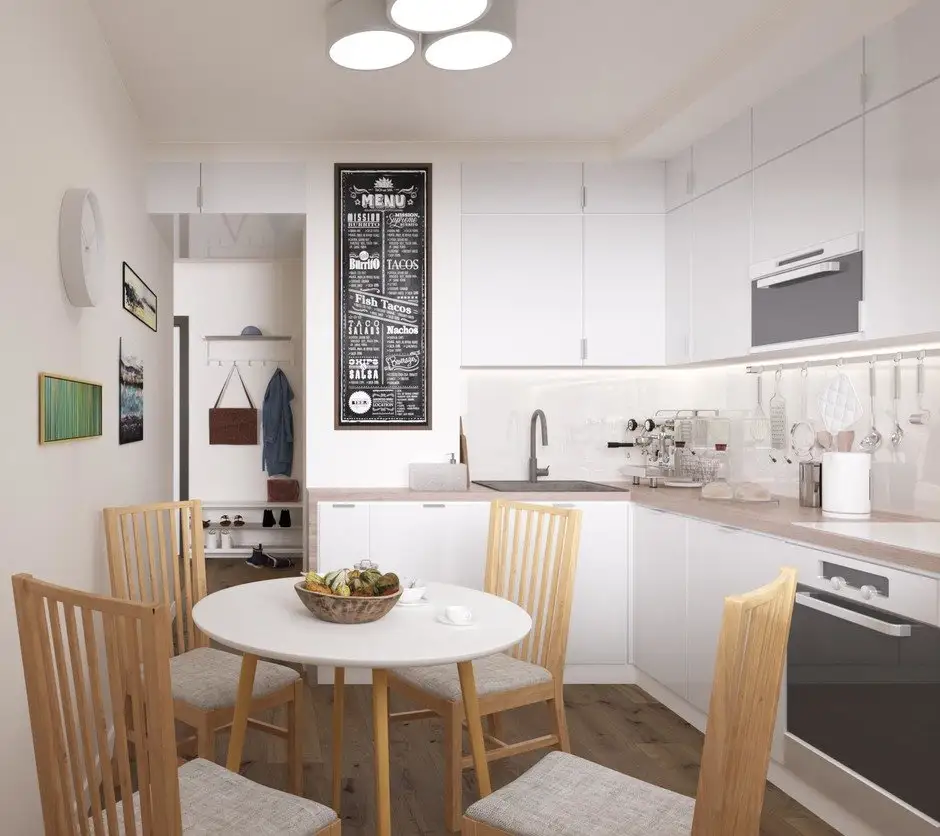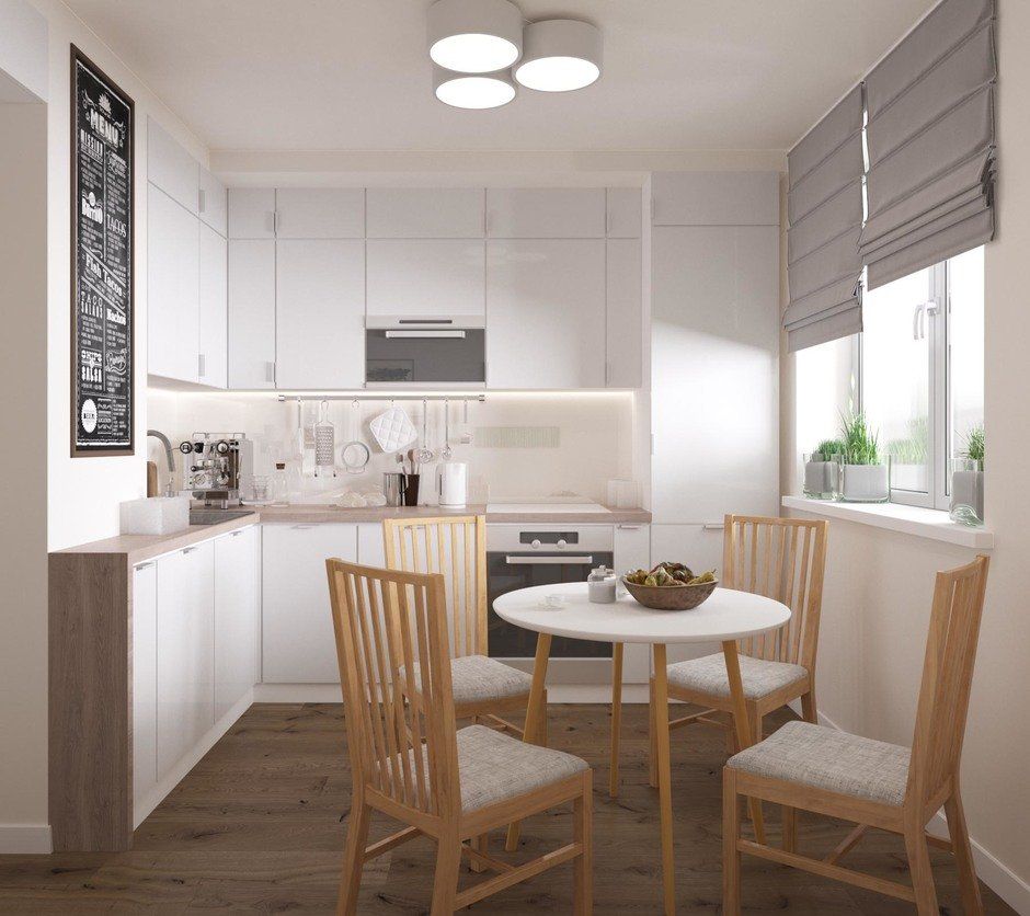 Bucataria are un rol important in aceasta amenajare, fiind un loc unde se gateste si unde sunt primiti membrii familiei sau prieteni apropiati. Totul este bine gandit pentru cei 8 metri patrati disponibili. Dispunerea in forma de L permite integrarea unui loc de luat masa.