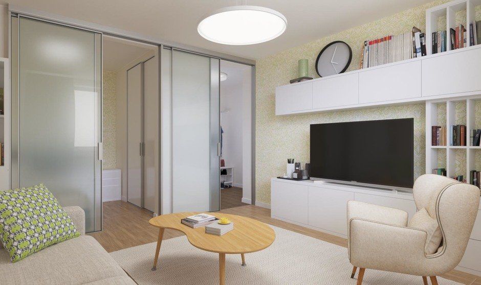 Spatiul din camera de zi a fost delimitat de cel de noapte printr-un sistem de usi glisante, cu sticla translucida, permitand astfel luminii naturale sa patrunda chiar si in zona de dormitor. Acelasi sistem de usi separa holul de camera de zi; practic avem 3 functiuni delimitate ingenios de acelasi sistem care nu ia din spatiu asa cum ar face-o usile batante (usile clasice).