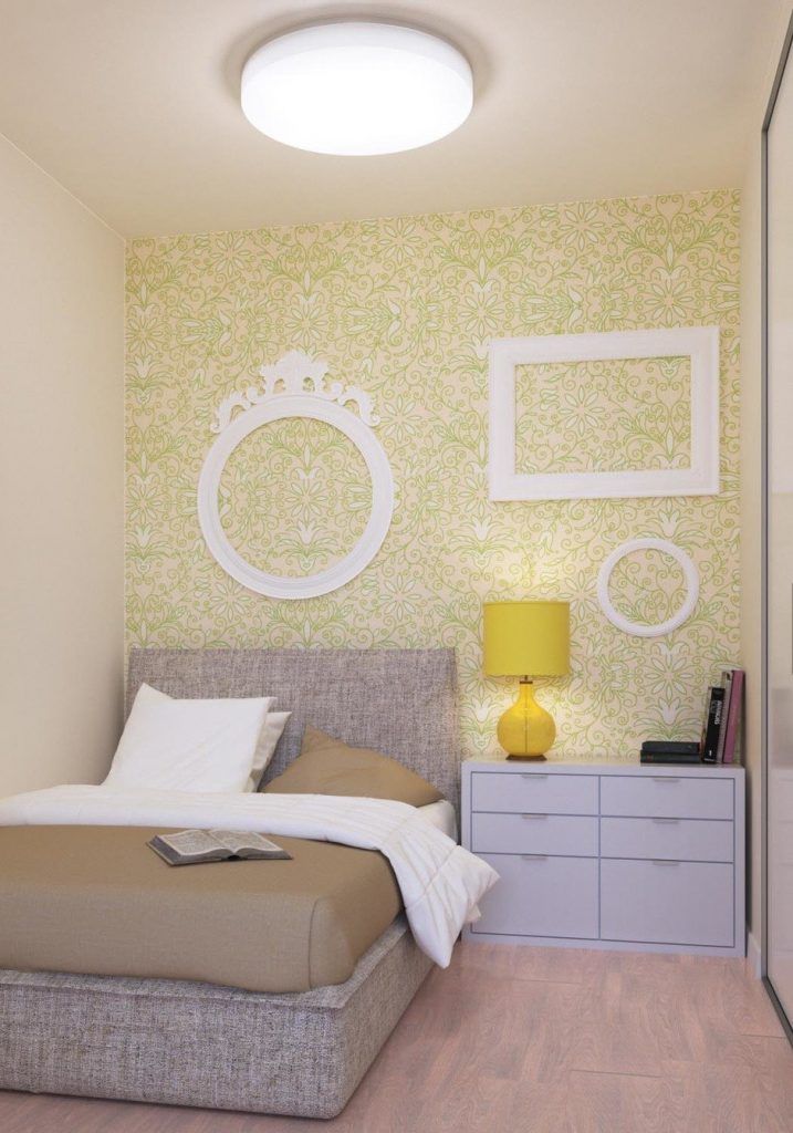 In spatiul mic al dormitorulului, de doar 6 metri patrati, fiecare element este optimizat pentru a contura un decor placut: pat, comoda si dulapuri pentru haine. Tapetul cu imprimeu verde descrie un perete-accent tonic, binevenit chiar si pentru un spatiu atat de mic. Acelasi tip de tapet il regasim si in camera de zi pe peretele cu biblioteca si televizorul.