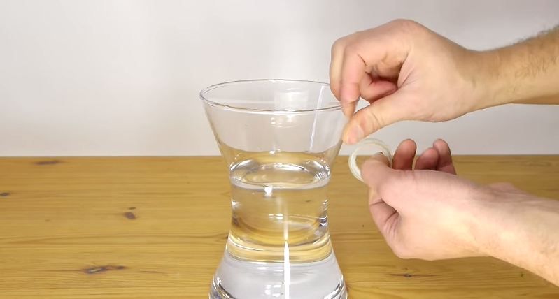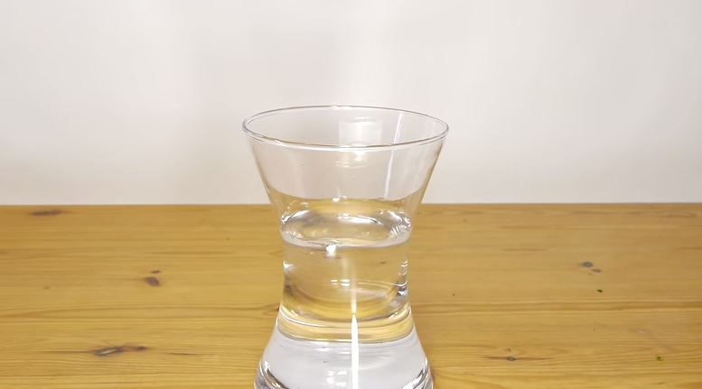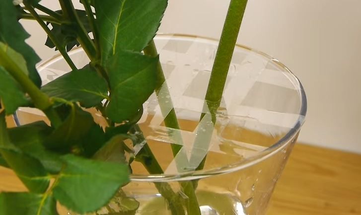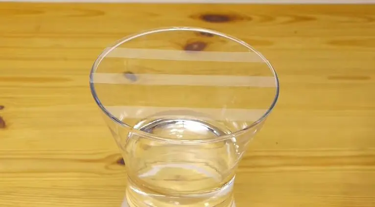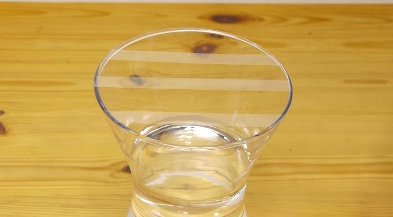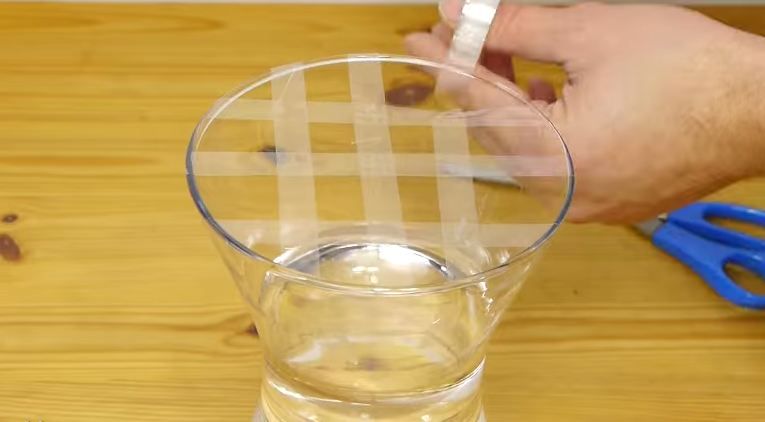 Luati vaza in care urmeaza sa aranjati florile si turnati cantitatea de apa necesara. Stergeti apoi cu un servet orice picatura de apa de la suprafata vazei. Apoi luati o rola de banda scotch transparent si lipiti benzi succesive deasupra gurii vazei; in functie de suprafata ei folositi cam 3-4 astfel de fasii.