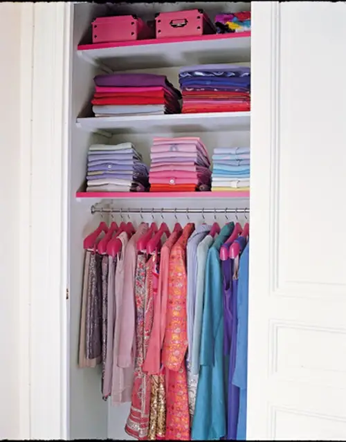 Incepem cu un sfat pentru doamne: sortati hainele si aranjati-le in functie de culori! Luati puloverele si bluzele in culori asemanatoare, strangeti-le asa cum le gasiti in magazine si ordonati-le apoi in interiorul dulapului. Folositi umerase pentru cele care necesita o astfel de depozitare. Veti avea astfel o compozitie mai atragatoare si ordonata.