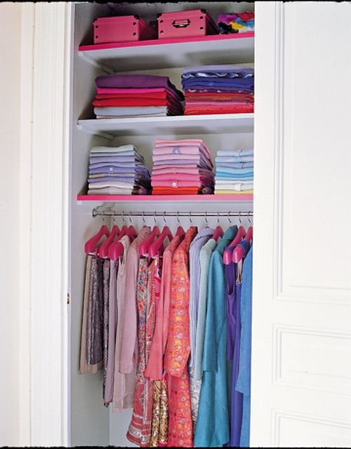 Incepem cu un sfat pentru doamne: sortati hainele si aranjati-le in functie de culori! Luati puloverele si bluzele in culori asemanatoare, strangeti-le asa cum le gasiti in magazine si ordonati-le apoi in interiorul dulapului. Folositi umerase pentru cele care necesita o astfel de depozitare. Veti avea astfel o compozitie mai atragatoare si ordonata.