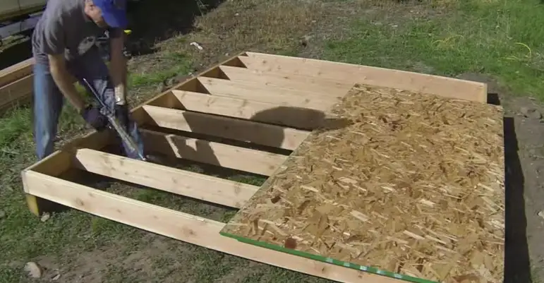 Printre primii pasi pe care trebuie sa-i faceti cunt pregatirea fundatiei din barne si pregatirea terenului. Este foarte important sa se urmareasca ca terenul sa fie drept iar forma viitoarei magazii sa fie perfect patrata. Dupa care urmeaza constructia podelei si acoperirea acesteia cu placa de USB. Va veti folosi de podea pentru a pune cap la cap si celelalte componente ale magaziei.