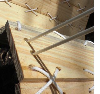 Pentru partea de sustinere construiti un patrat din scanduri (ca cel din imagine) in colturile caruia au fost fixate mici scanduri cu gauri prin care se vor introduce sforile de sustinere;