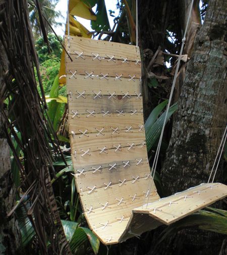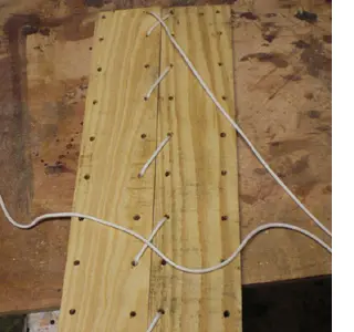 Dupa ce ati pus cap la cap toate elemetele leaganului incepeti sa introduceti sfoara prin gaurile din scanduri incercand sa pastrati ordinea. Urmariti fotografia alaturata pentru a intelege mai bine;