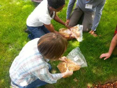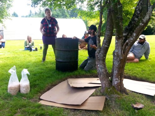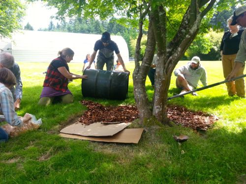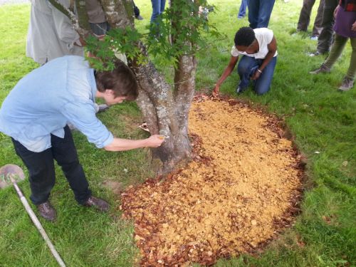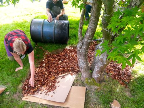 Sapa o groapa superficiala in dreptul unui copac. Este suficient sa faci forma unui semicerc, pentru a nu planta intr-un cerc complet, acoperind astfel toata suprafata bazei copacului. Odata sapata groapa, aplica niste carton care va ajuta la mentinerea umezelii. Odata imprastiati sporii, mai adauga un strat de lemne in bucatele, iar gradina ta de ciuperci este gata.