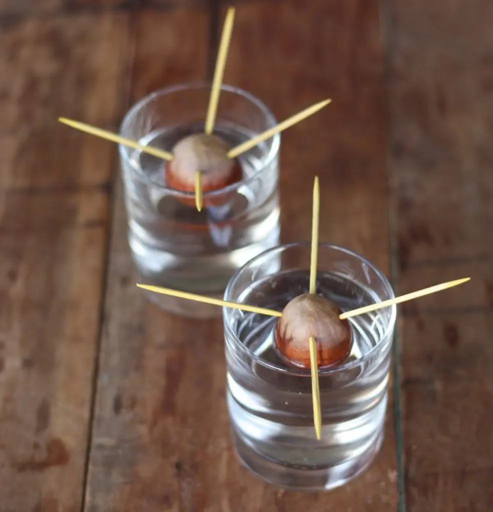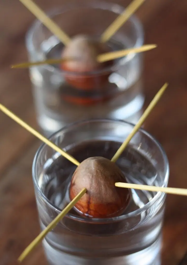 Odata uscat, introdu 4 scobitori usor in sambure si pune-l intr-un pahar cu apa, cu partea mai ascutita a samburelui orientata in sus. Sa nu infigi prea tare scobitorile, deoarece, in mod surprinzator, acestea vor intra cu mare usurinta in interior.