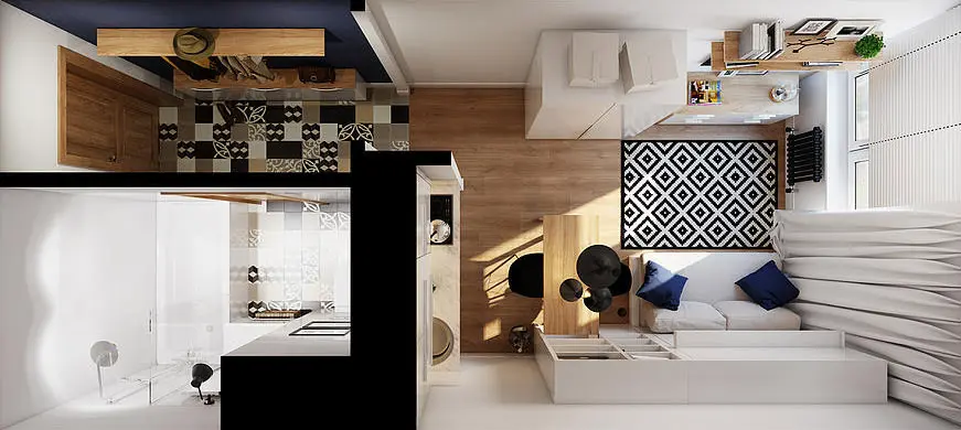 Cu greu ai putea sa spui ca iti place un astfel de loc. Dar imaginile vorbesc de la sine; designerii au reusit sa contureze un spatiu echilibrat, elegant, intr-un stil minimalist absolut necesar pentru a putea sa locuiesti confortabil intr-unapartament de doar 19 metri patrati!