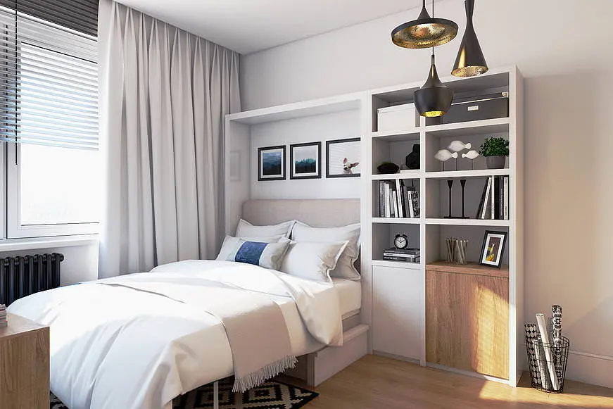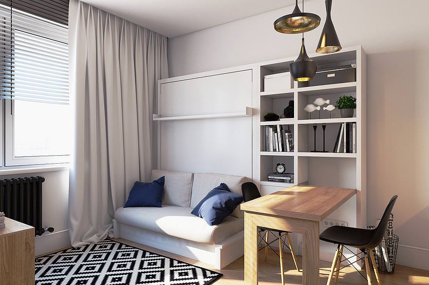 Patul rabatabil transforma zona intr-una de dormit pe timpul noptii