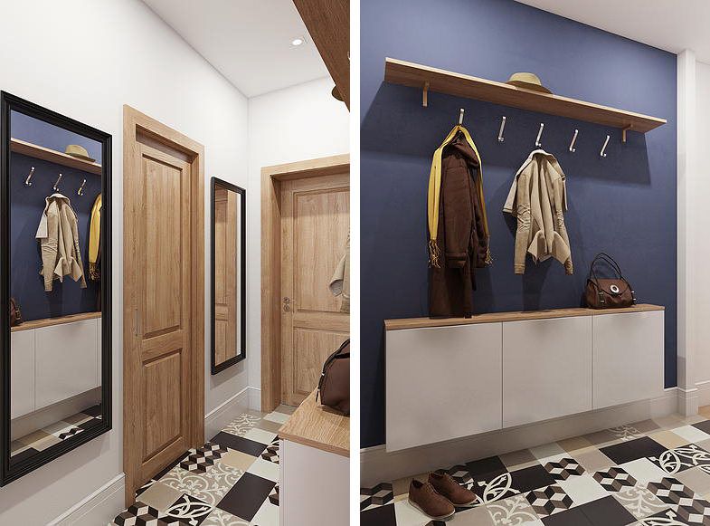 Amenajarea holului cu perete albastru si gresie stil patchwork