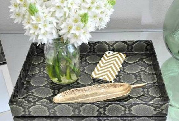 O tava decorativa pentru masuta din sufragerie, unde poti pune o vaza sau tine diversele lucruri mici din casa, poate fi amenajata cu stil, apeland la banda adeziva cu model de piele de sarpe