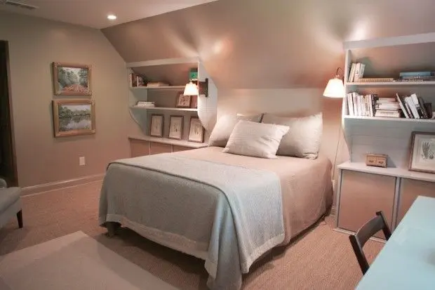 In cazul in care zona inclinata face parte dintr-o camera foarte mica, va recomandam sa ii oferiti un scop practic, cum ar fi spatiu pentru depozitare. Montati etajere de-a lungul peretelui si luati in considerare ce si cum veti depozita pe ele pentru a maximiza unghiurile.