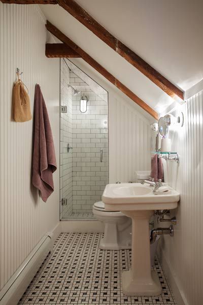 Baie cu tavan inclinat pentru un plus de interes au fost adaugate grinzile