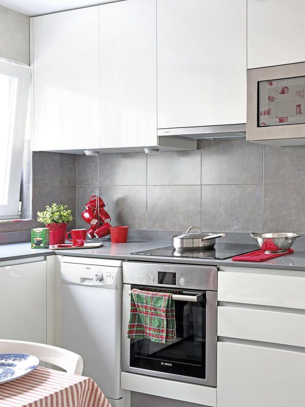 Nici spatiul bucatariei nu a fost ignorat. Aici a fost ales un tapet tematic cu insertii de rosu; astfel, pe un fundal de alb si gri, incaperea pare mai dinamica si mai vesela. Corpurile de mobilier albe, inalte pana in tavan asigura nevoia de depozitare si de functionalitate pentru gatit.