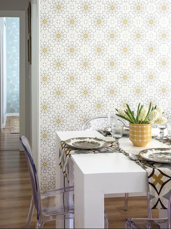 Daca peretii cu tapet sunt centrele de interes ale amenajarii, pardoseala contribuie la crearea unei unitati a spatiului amenajat, echilibrand decorul. Si tonurile de gri alaturi de alb reusesc sa puna in valoare modelele de tapet folosit.