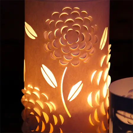Daca prin bucatarie veti gasi pahare sau alte recipiente de sticla pe care nu le mai folositi, dati-le o alta intrebuintare si utilizati-le in proiectul dumneavoastra pentru lampioane. Indoiti hartia si asezati-o pe suportul de sticla selectat. Lipiti colturile cu adeziv si iata, lampioanele sunt gata.
