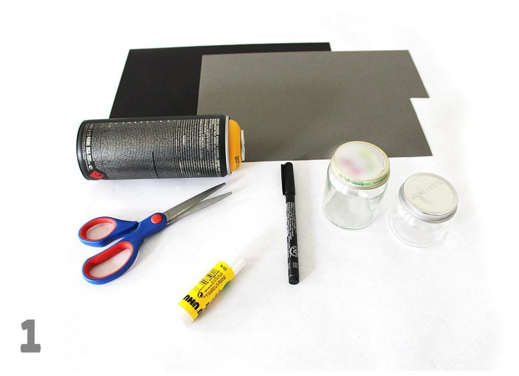 Deschide GaleriaPasul 1 Aveti nevoie de borcanele de sticla (noi am folosit unele de la piureul pentru bebelusi, dar puteti folosi orice recipient micut de sticla), un spray cu vopsea galbena, 2 cartoane A4 – unul gri si unul negru, o foaie alba A4, lipici pentru hartie, un marker permanent si o foarfeca.