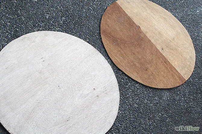 Masurati circumferinta cauciucului si taiati doua cercuri din doua bucati de placaj pe care le veti monta deasupra si dedesubtul cauciucului. Cel de dedesubt trebuie sa aiba un diametru cu patru centimetri mai mic decat celalalt.