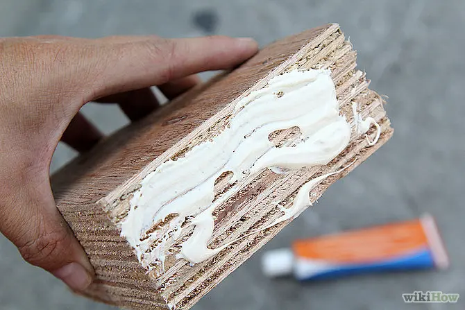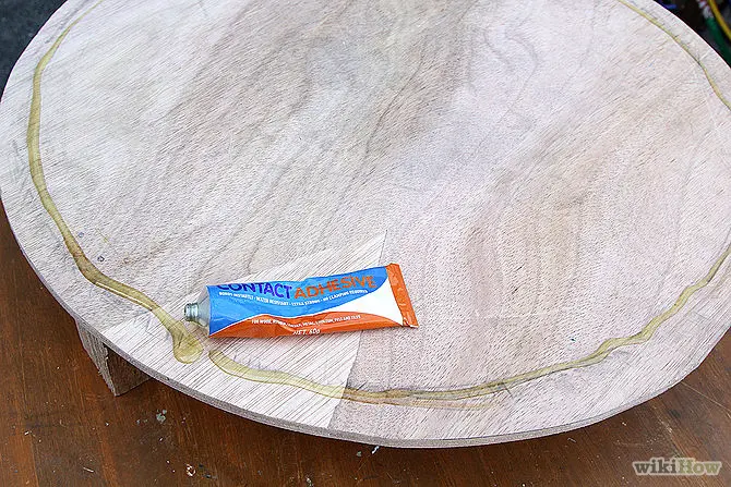 Lipiti apoi cele doua bucati de placaj pe cauciuc cu adeziv. Lacuiti picioarele de lemn ale masutei sau vopsiti-le dupa plac.