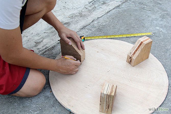 Masurati circumferinta cauciucului si taiati doua cercuri din doua bucati de placaj pe care le veti monta deasupra si dedesubtul cauciucului. Cel de dedesubt trebuie sa aiba un diametru cu patru centimetri mai mic decat celalalt.