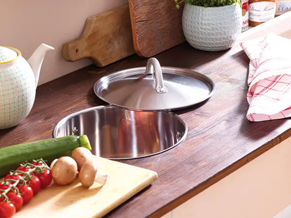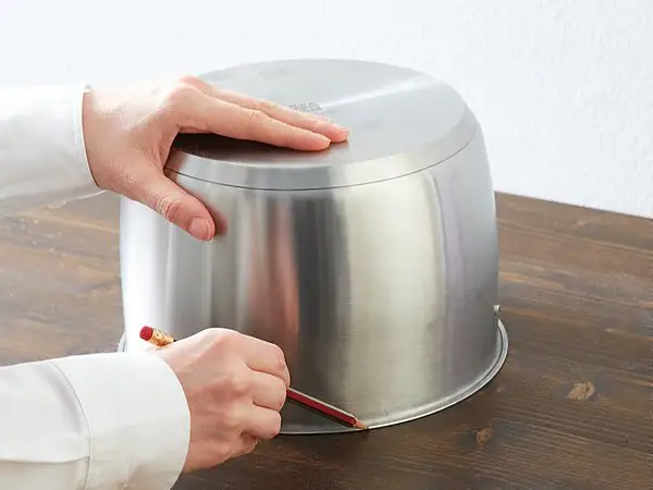 Puneti oala cu fata in jos pe blatul unde vreti sa amenajati cosul, si trasati cu creionul cercul care, ulterior, sa va ajute la taiere. Daca nu aveti o ustensila speciala cu care sa puteti taia o forma perfect circulara in blat, folositi fierastraul pendular. Mai intai faceti o gaura cu bormasina in centrul cercului apoi incepeti taierea din acest punct.