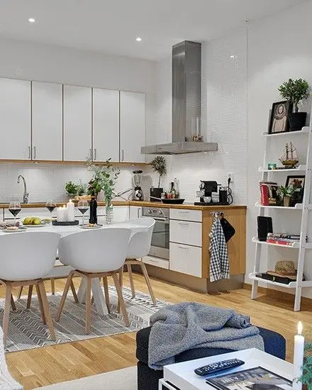 In bucatariile de dimensiuni mai mici sunt suficiente doua tipuri de iluminat pentru a crea un ambient placut si un nivel corect de lumina. Ca recomandari pentru astfel de spatii, ne putem limita la un corp central pentru un iluminat general si apoi la un iluminat local pentru blatul de lucru sau iluminat pentru blat si iluminat ambiental in zona mesei.