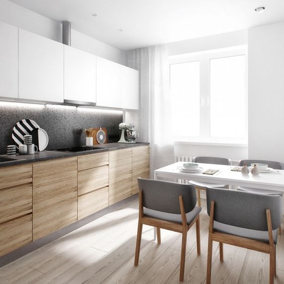 In bucatariile de dimensiuni mai mici sunt suficiente doua tipuri de iluminat pentru a crea un ambient placut si un nivel corect de lumina. Ca recomandari pentru astfel de spatii, ne putem limita la un corp central pentru un iluminat general si apoi la un iluminat local pentru blatul de lucru sau iluminat pentru blat si iluminat ambiental in zona mesei.