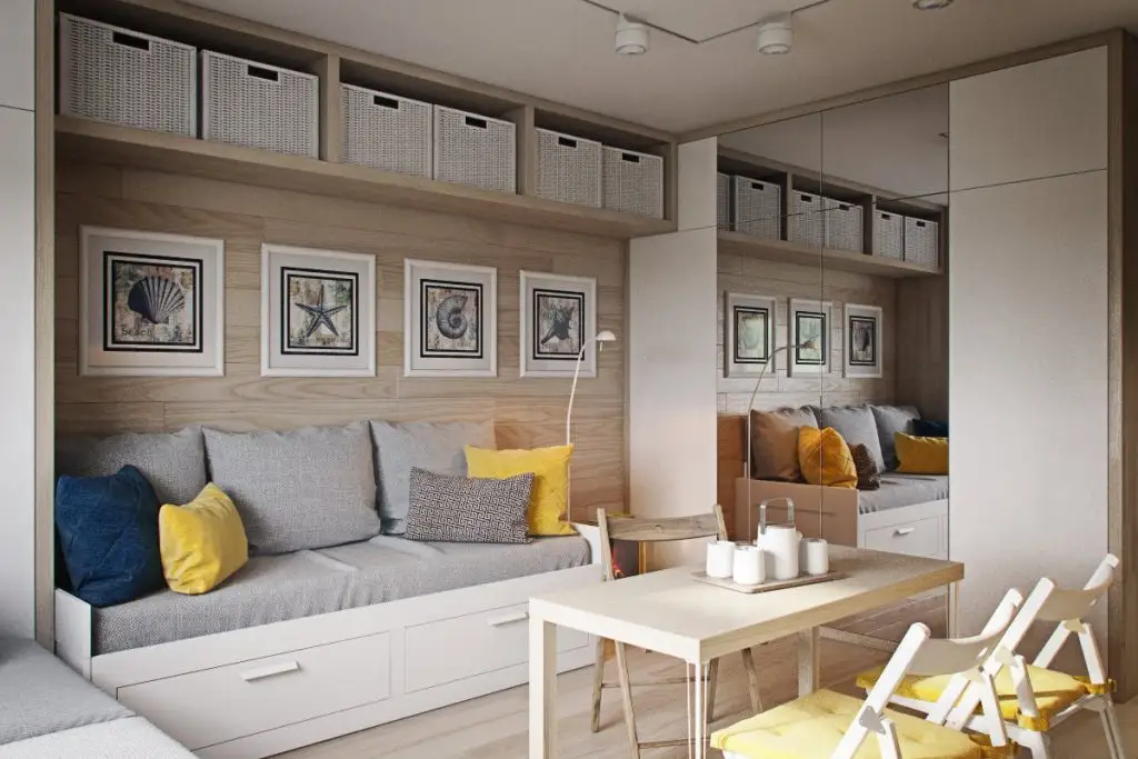 Solutiile de depozitare sunt variate in aceasta amenajare: de la pantofarul amenajat la intrare, continuand cu dulapurile din hol (unde a fost incorporata masina de spalat) si cu cele din camera, pana la spatiile de sub cele locuri de sezut. Totul este gandit compact si unitar intr-o inlantuire armonioasa, spatiul beneficiind de functiunile intalnite in orice amenajare.