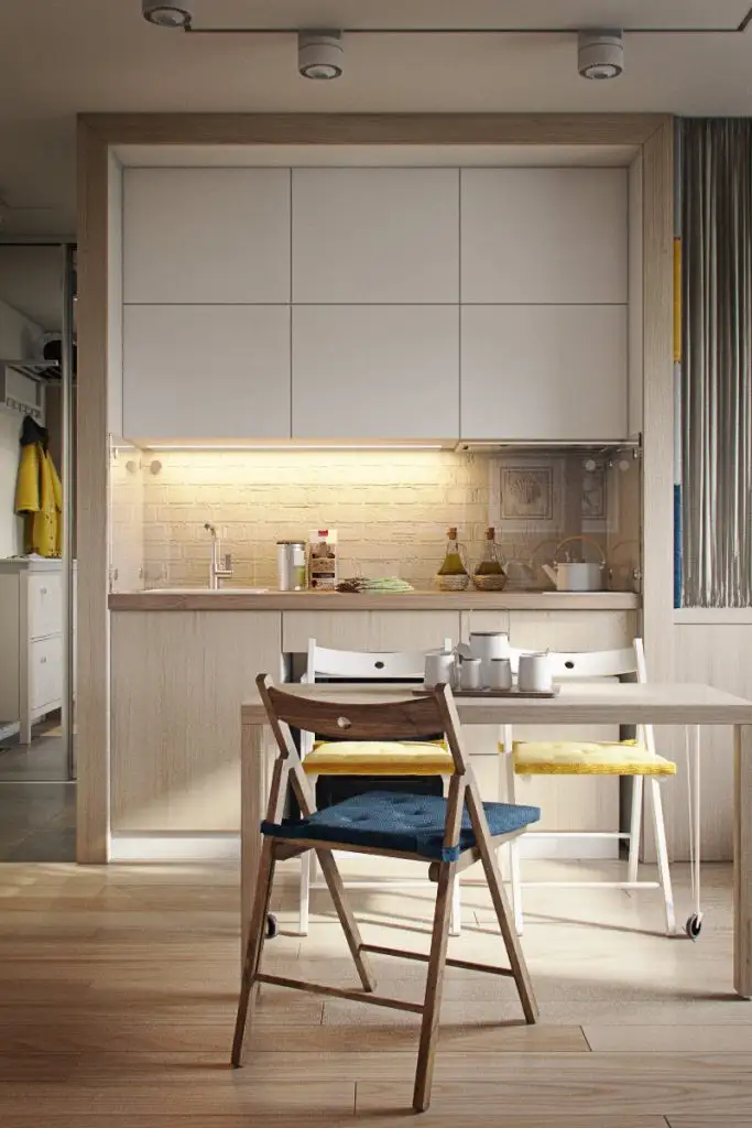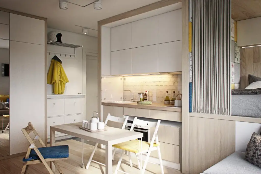Spatiile mici ne tot apar in cale; astazi, am ales sa ne oprim asupra acestui apartament de doar 20 de metri patrati. Daca nu ti-ai putea imagina vreodata cum e sa locuiesti intr-un astfel de apartament, proiectul realizat de Olga si Yuri vine sa demonstreze ca se poate si mai ales cum. Haideti sa vedem in detaliu amenajarea.