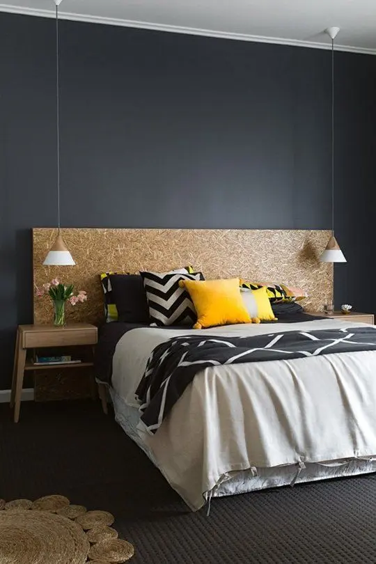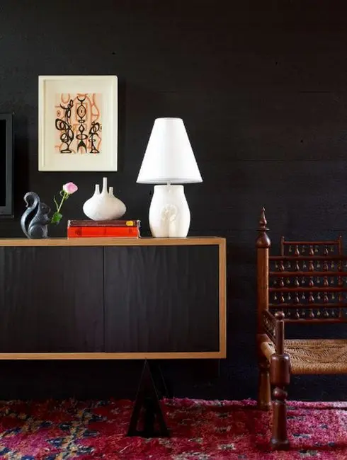 Negrul peste negru este monoton si nu ofera nimic spectaculos. Puteti alterna sau stratifica vizual accentele de culori. Daca peretele este negru si noptiera sau dulapul in aceeasi nuanta, adaugati decoratiuni albe sau colorate pentru a evidentia ambele elemente dar fara a parea obositor.