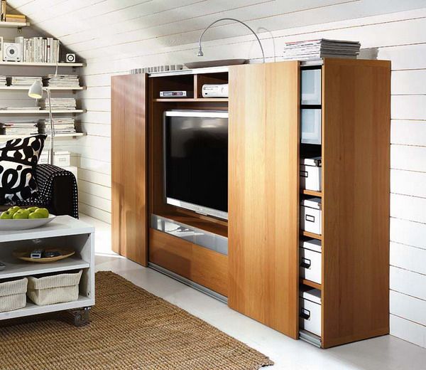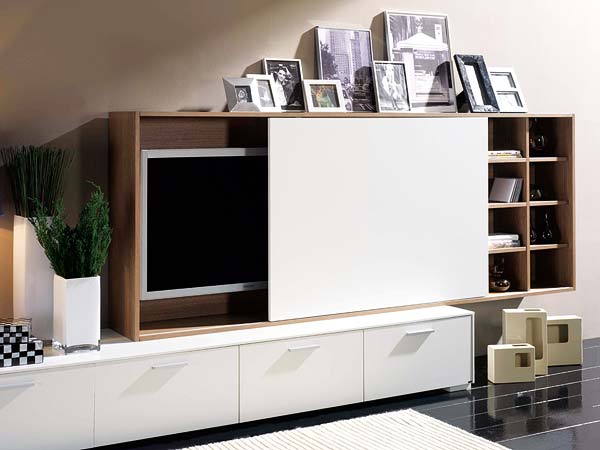Pentru cei care folosesc tv-ul rar, o idee originala este de a-l ascunde . O usa glisanta va facilita acest lucru; cateva rafturi discrete vor acompania armonios decorul mobilei. Daca tv-ul se afla in spatiul dedicat biroului, poti folosi doua usi mari care sa-l acopere, in timp ce spatiul din dreapta sau stanga sa iti permita stocarea actelor si a altor documente.
